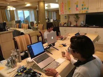 メンバー全員で進捗報告&振り返り。進捗イイ感じ! 20:00には開発は終了し、お酒飲んで、人狼やって、卓球やって、サウナ入って、もう最高!! 楽しすぎて、写真撮るの忘れてました。ごめんなさい。。。