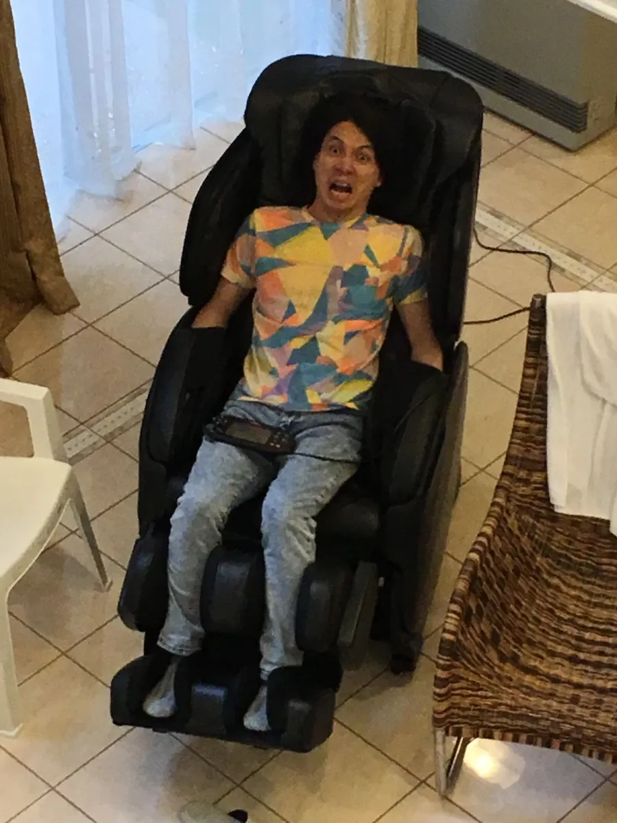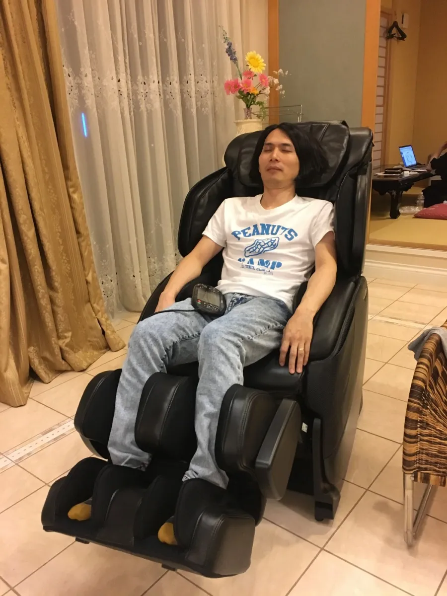 マッサージチェアーで休憩中のメンバー。 なんやその顔ww